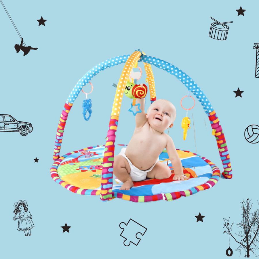 Gym bermain berwarna cerah dengan mainan di atas kepala