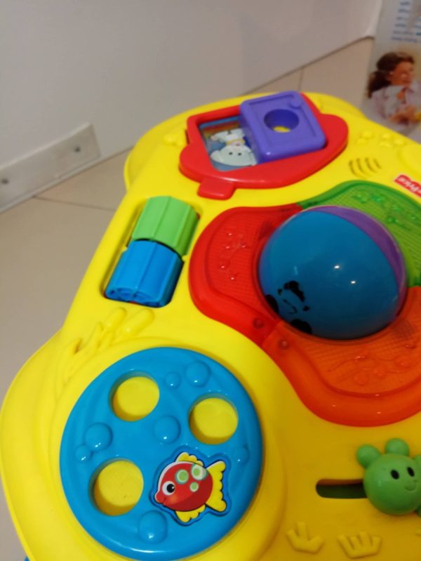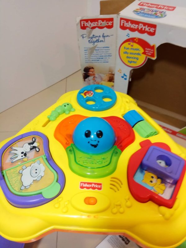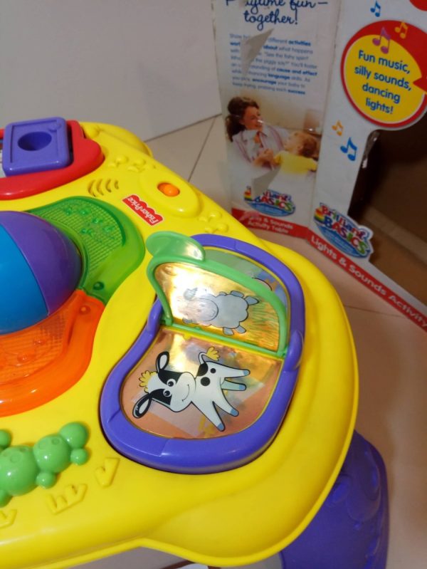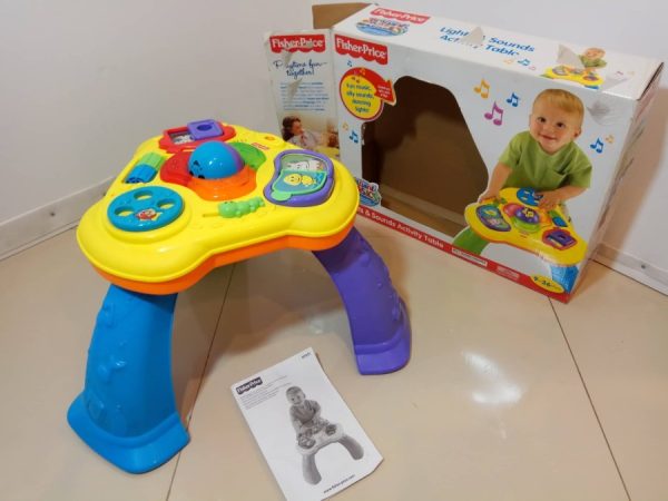 Brilliant Basics Lights & Sounds Activity Table sarat dengan hal menyenangkan bagi bayi. Berputar bola besar untuk mendengar lagu atau efek suara. Lampu menari dari atas meja berwarna-warni sebagai memainkan musik. Bayi dapat membolak balik halaman-halaman buku atau pintu untuk mendengar suara.