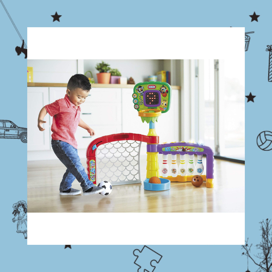 3-IN-1 ZONA AKTIVITAS OLAHRAGA – Tiga kali lipat permainan! Dunk bola basket, tendang gawang sepak bola, dan lempar pukulan dalam permainan bowling.
